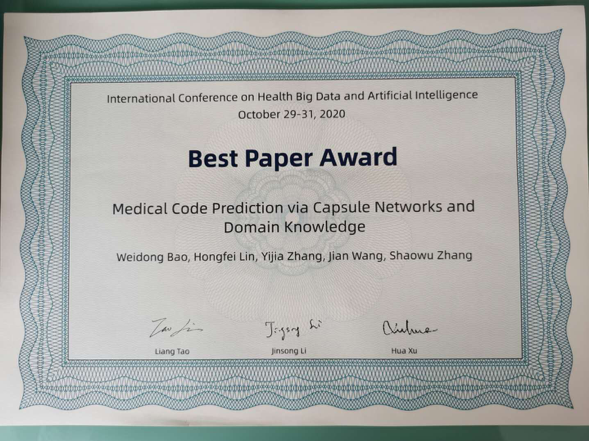 2020年10月29日-11月1日实验室师生参加了广东省广州市召开的健康医疗大数据与人工智能前沿论坛,本次论坛由中山大学、OHDSI中国、中国生物医学工程学会数字医疗及医疗信息化分会联合主办,会议邀请了国内、外的健康医疗信息顶尖专家学者和优秀同行,与业内同仁们分享医疗卫生信息化、健康医疗大数据分析与应用、医学人工智能、医学信息标准与术语、医疗质量与患者安全、精准医学、数据安全与隐私等前沿技术领域的最新研究和应用成果,展示健康医疗新模式、新技术和新产品,进一步促进健康医疗信息领域的研究交流、工作推进、人才培养与国际合作。实验室的科研论文“Medical Code Prediction via Capsule Networks and Domain Knowledge”获得了本次会议的最佳论文