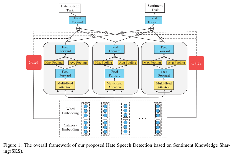 算法模型:本文提出了一种新的框架SKS,引入外部情感资源获取更多的情感特征,提升模型对仇恨言论的检测性能:在编码层中利用预训练词向量GloVe获取一般的文本表示Word Embedding,之后引入外界词表,融入单词的侮辱性信息Category Embedding;在解码层中,采用多任务学习的方法使模型学习和共享外部情感知识(sentiment knowledge sharing),同时使用多个特征提取单元,每个提取单元使用多头注意机制和前馈神经网络来提取特征,获取文本的潜在的语义信息,最后使用门控注意力融合特征。SKS的模型架构图如下所示: