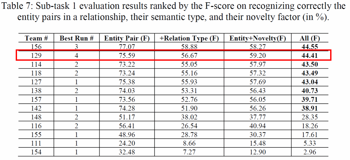 该赛道由美国国立卫生研究院(NIH)的国家生物技术信息中心(NCBI)主办,目标从摘要级别文本中自动抽取出药物、疾病等多种生物医学实体以及其语义关系,并确定其是否是本文的创新关系。实验室队伍(表格中为Team129)提出了一种多任务联合学习方法,通过增强关系抽取的中间步骤,缓解误差累积问题,提升关系分类与端到端联合关系抽取的性能,在本赛道的两个子任务中均荣获排名第2的成绩。