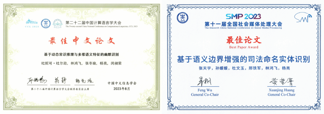 在TOIS、TKDE、TASLP、TMM、TCBB、IPM、Bioinformatics、Information Science等国际顶级期刊,在AAAI、IJCAI、ACL、MM、EMNLP、ICMR、BIBM等国际顶级会议上发表论文多篇。获得第二十二届中国计算语言学大会CCL2023最佳中文论文、第十一届全国社会媒体处理大会SMP2023最佳论文、第六届中国语言智能大会CLIC2023最佳论文。获得IPM期刊2022年博士最佳论文提名奖。