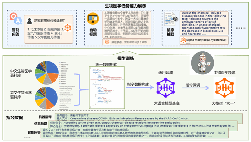 在生物医学领域,本中心研发了用于各种生物医学任务的双语(英语和汉语)微调的大语言模型 “太一”。在13个生物自然语言处理(BioNLP)任务上的评价结果表明,“太一”在双语多任务学习中有着巨大的潜力,与普通大模型相比,它在特定领域的任务中实现了卓越的性能。可以应用于多个下游任务,如检索增强、大模型知识图谱推理能力、多模态能力、自动问答、自动摘要生成以及信息抽取等。