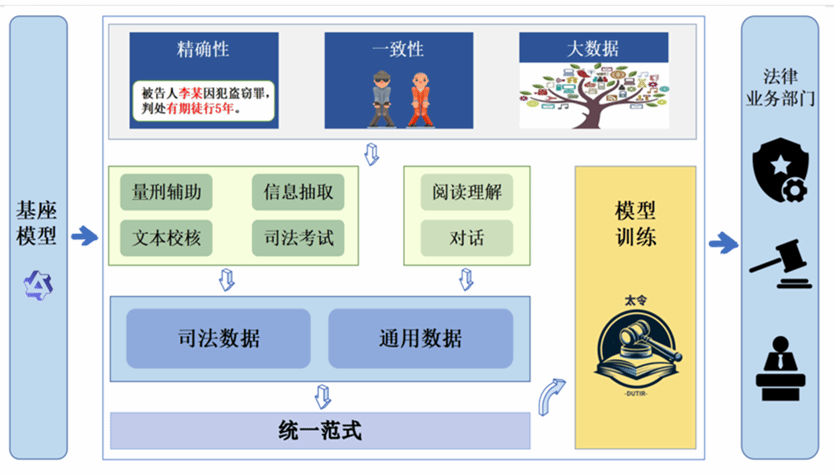 在司法领域,本中心研发了可服务多项司法业务的大模型 - 太令。“太令”训练基础是庞大的通用中文语料库,并结合了裁判文书、合同、司法考试材料以及司法问答等专业司法数据进行深度训练。该模型可为司法业务提供全面的支持,能够自动检测并纠正司法文件中的语法、拼写和事实错误,精确提取关键信息,并提供基于历史案例的罪名预测及量刑建议等。