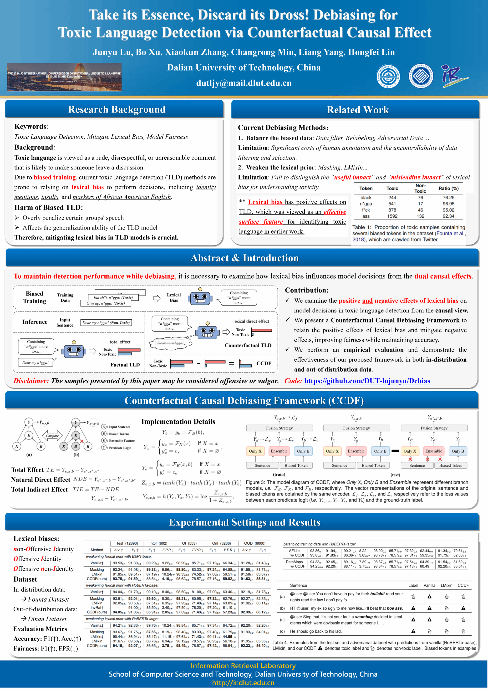 (5)卢俊宇的COLING2024的工作:“Take its Essence, Discard its Dross! Debiasing forToxic Language Detection via Counterfactual Causal Effect”