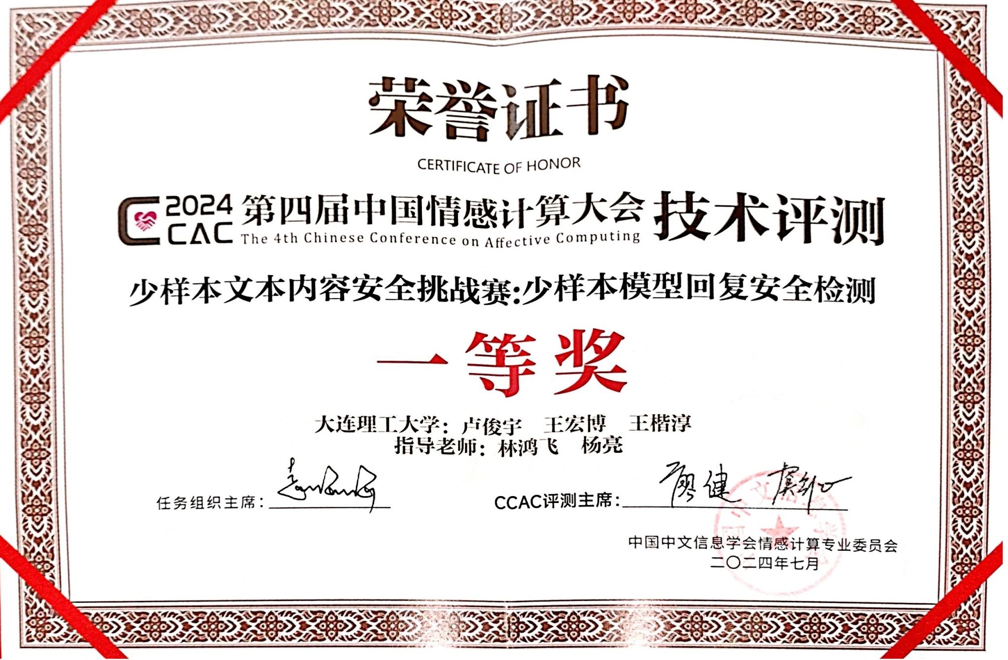 (1)卢俊宇、王宏博、王楷淳,获得赛道一“少样本文本内容安全挑战赛:少样本模型回复安全检测”一等奖