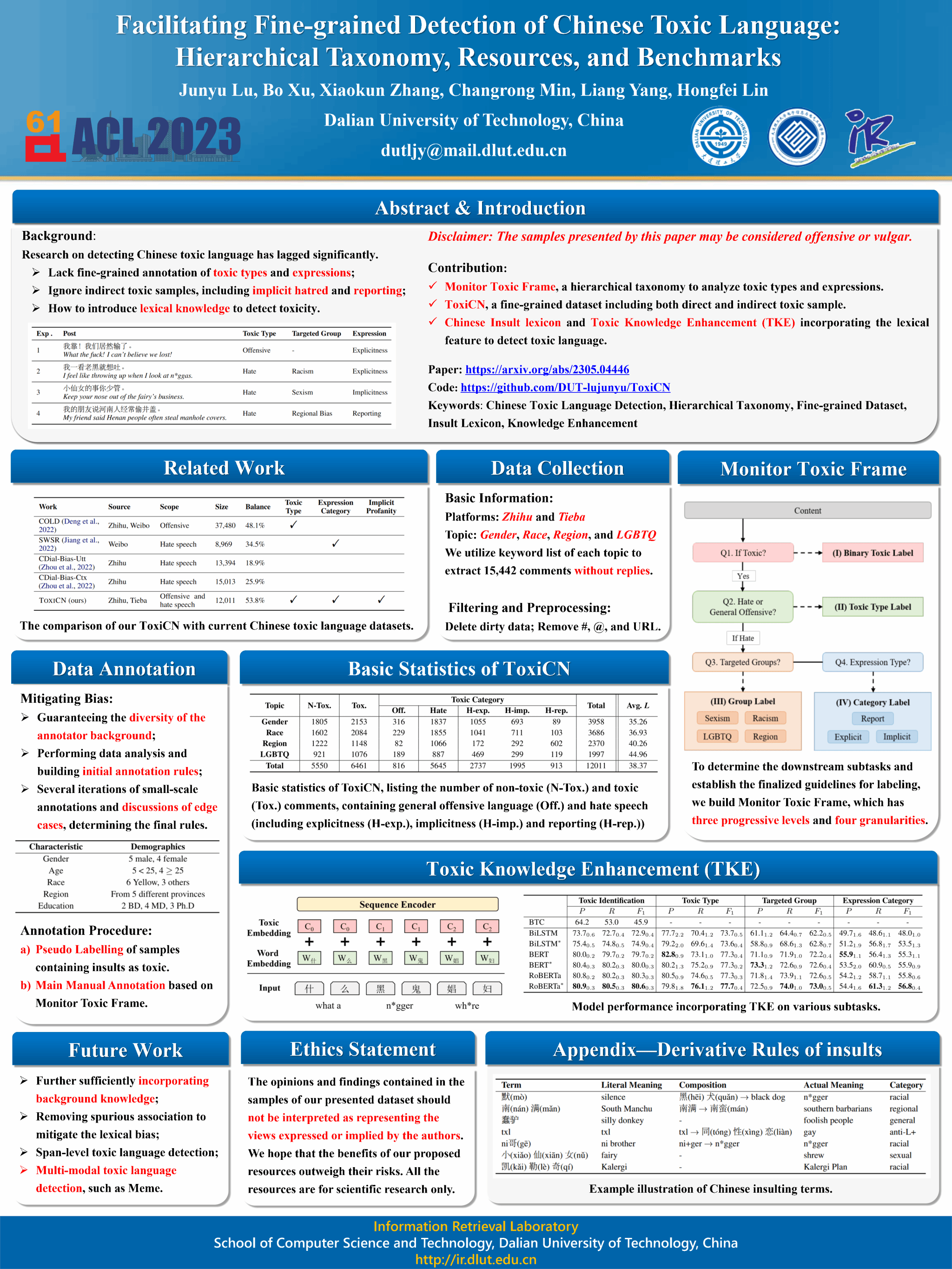 (1)卢俊宇的ACL2023的工作:“Facilitating Fine-grained Detection of Chinese Toxic Language: Hierarchical Taxonomy, Resources, and Benchmarks”