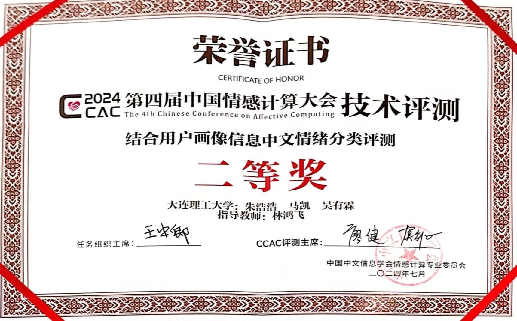 (2)朱浩浩、吴有霖、马凯,获得赛道三“结合用户画像信息中文情绪分类评测”二等奖