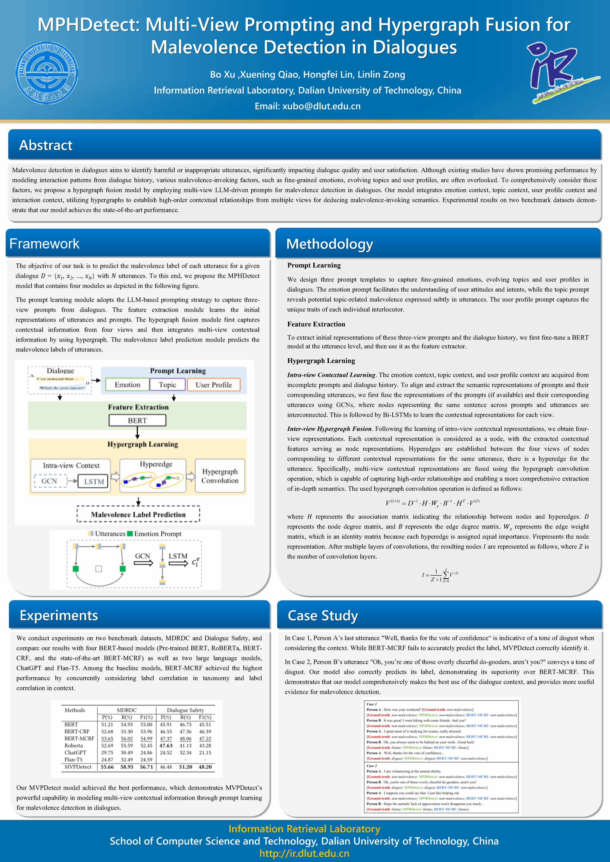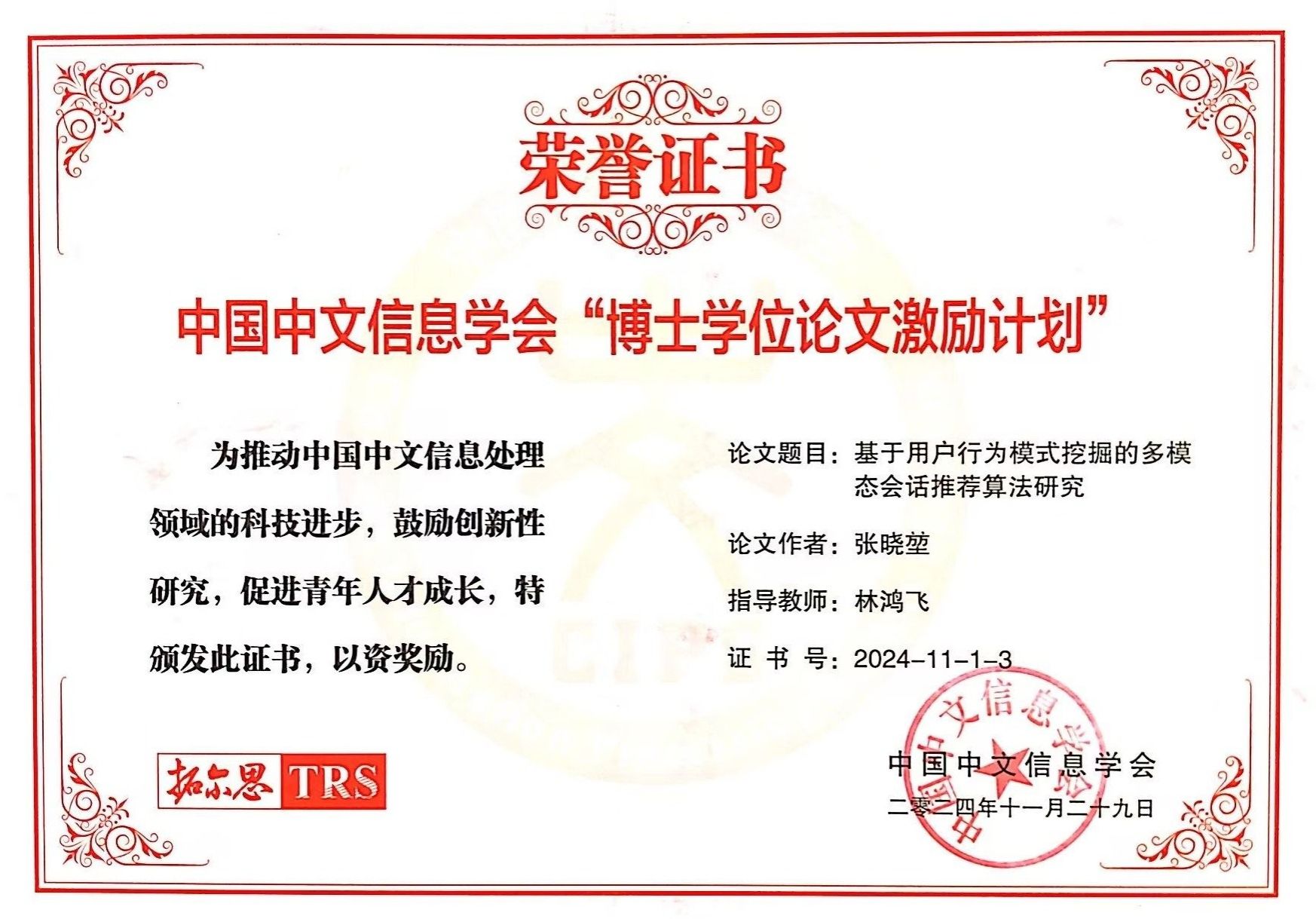实验室张晓堃博士入选2024年中国中文信息学会“博士学位论文激励计划”,以表彰过去一年中优秀的博士学位论文,全国共计10名博士入选该计划。张晓堃博士于2024年6月通过答辩,博士学位论文题目为《基于用户行为模式挖掘的多模态会话推荐算法研究》。张晓堃博士的研究成果发表在TOIS、TKDE、TASLP、IP&M等国际顶级期刊以及SIGIR、ACL、NeurIPS、COLING、BIBM等国际顶级会议,同时获得SIGIR 2024最佳论文候选奖及IP&M 2022最佳博士论文提名奖等荣誉。