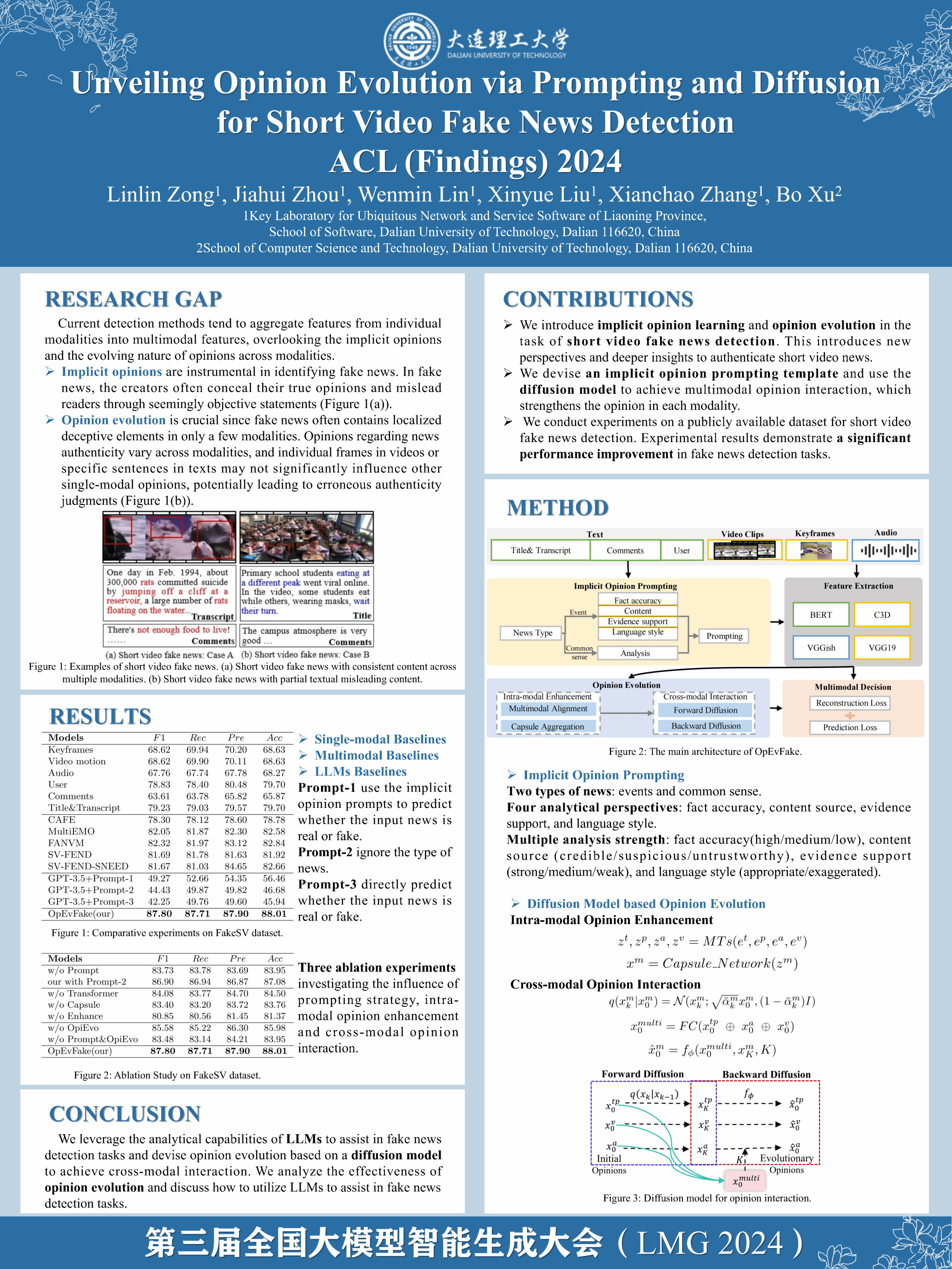 (2)徐博老师等发表在ACL2024 findings的工作:Unveiling Opinion Evolution via Prompting and Diffusion for Short Video Fake News Detection