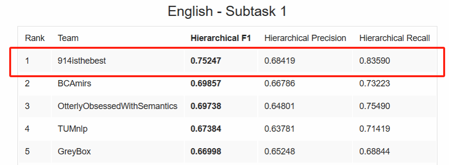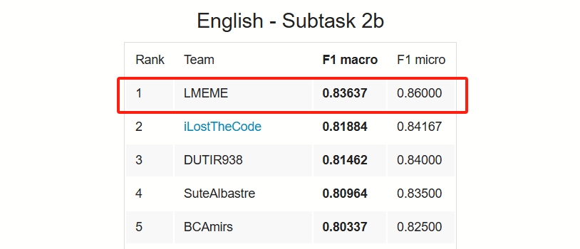 实验室队伍LMEME提出了一种教师-学生融合框架,利用知识蒸馏的方法,有效提高了模型对说服技巧的识别能力,在Subtask 2b荣获第一名。结果排行表如下: