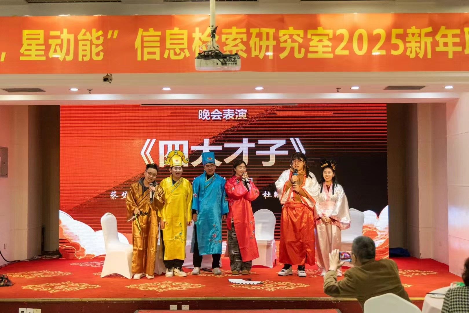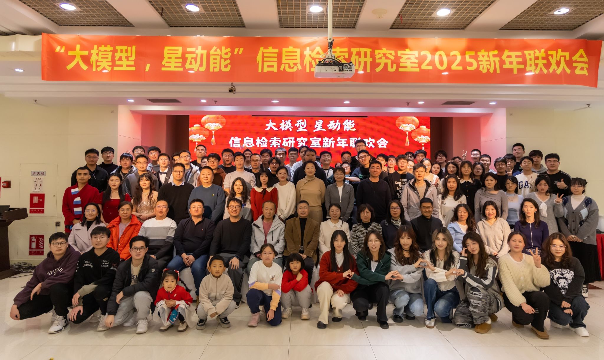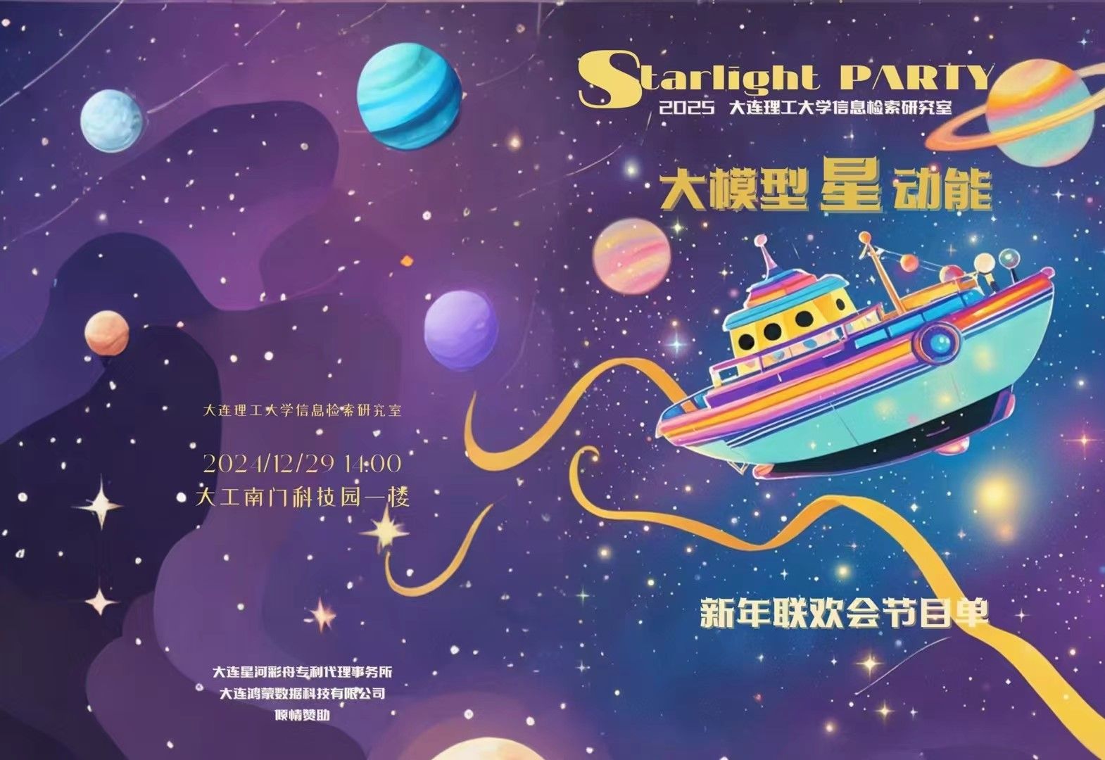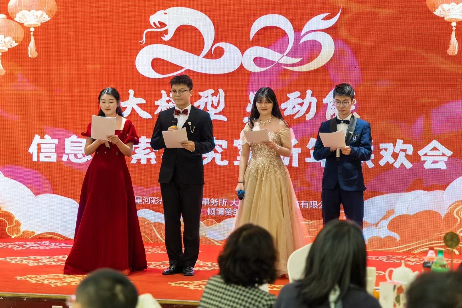 2024年12月29日下午,实验室在科技园酒店一楼大厅举行以“大模型 星动能”为主题2025年新年联欢会,实验室师生以及毕业校友共计百余人参加。“星河彩舟,与AI同行。鸿蒙数据,以IR为伴。”此次盛会得到了校友企业“星河彩舟专利代理事务所”和“鸿蒙数据科技有限公司”的鼎力赞助。
