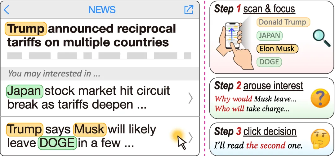 中文摘要:新闻推荐旨在根据用户的阅读历史为他们提供个性化的阅读体验。行为科学研究表明,基于屏幕的在线新闻阅读包含三个连续的步骤:扫读、标题阅读以及点击。依照这些步骤,我们发现用户对新闻内部实体的兴趣在扫读阶段占主导地位,而跨越不同新闻间的实体兴趣指导了标题阅读过程并最终影响点击决策。不幸的是,当前的方法忽略了新闻推荐中实体的独特效用。为此,我们提出了一种名为IP2的新方法,以探测实体在新闻内和新闻间两个层次引导的阅读兴趣。在新闻内层次,我们设计了一种基于Transformer的实体编码器,用于将新闻标题中提及的实体聚合为一个签名实体。然后,采用签名实体-标题对比预训练来利用上下文信息对实体含义进行初始化,这同时也促成了对新闻内实体兴趣的探测。对于新闻间层次,我们提出了一种双塔用户编码器,以同时捕捉来自标题语义和实体表示两方面的阅读兴趣。此外,为了突出新闻间实体引导的贡献,采用了一种跨塔注意力连接来校准标题阅读偏好,从而进一步与现实世界的用户行为模式对齐。在两个真实世界数据集上的广泛实验表明,我们的IP2在新闻推荐中达到了领先的性能表现。