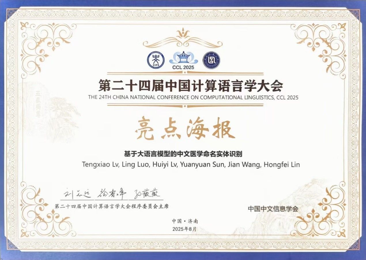 (3) 吕腾啸,罗凌,孙媛媛,王健,林鸿飞,“基于大语言模型的中文医学命名实体识别”