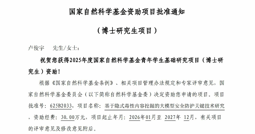 近日,国家自然科学基金委员会公布了2025年度国家自然科学基金青年学生基础研究项目(博士研究生)立项名单,博士生卢俊宇申报的项目获得资助批准。