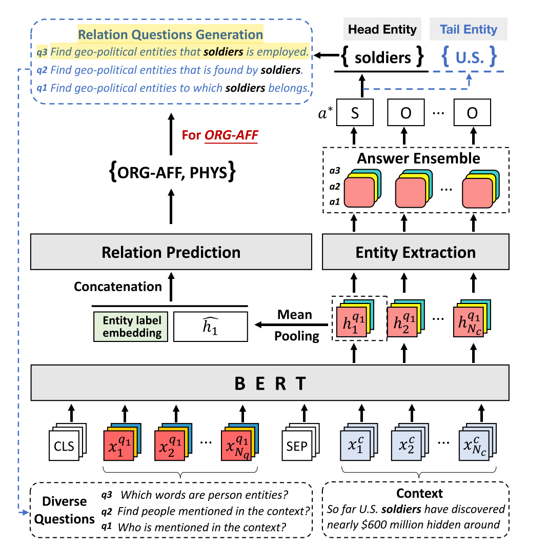 最近的进展将实体关系提取转换为多回合问答(QA)任务,并基于机器阅读理解(MRC)模型提供了有效的解决方案。但是,他们使用单个问题来描述实体和关系的含义,由于上下文语义的多样性,这在直观上还不够。同时,现有模型枚举所有关系类型以生成问题,这效率低下并且容易导致混淆问题。