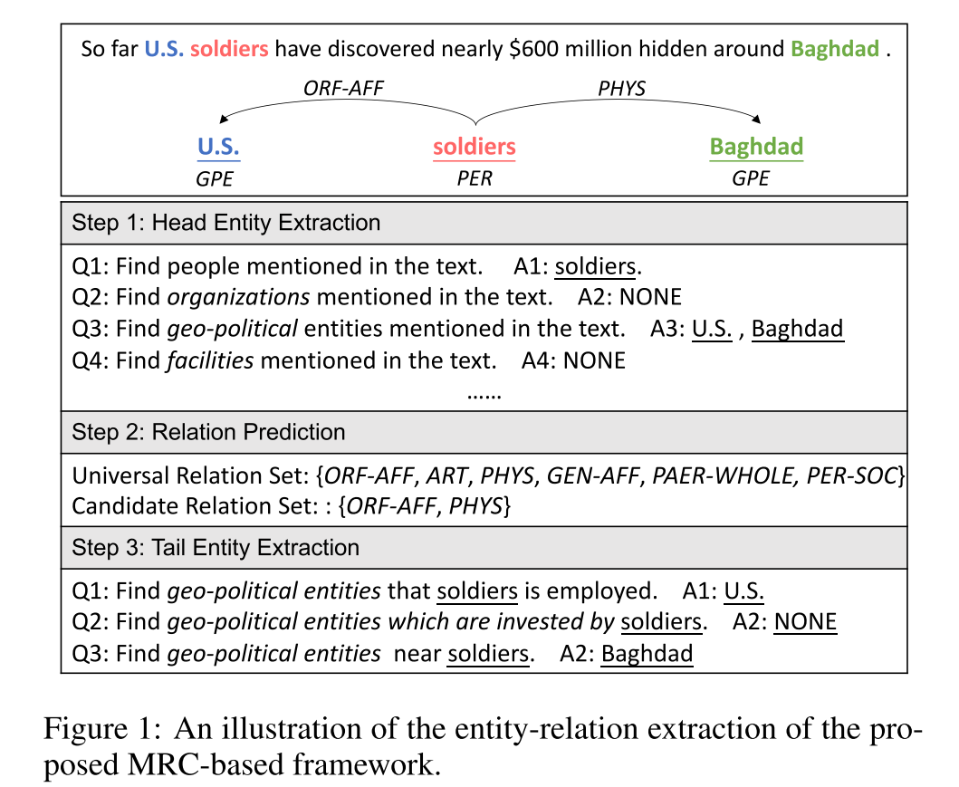 1:首先通过使用机器阅读理解模型回答实体特定的问题,从上下文中检测头部实体。