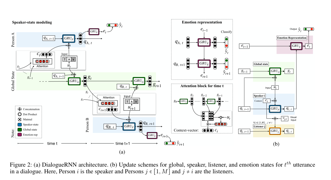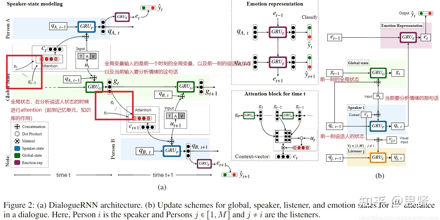 模型的细节如图片标记所示,全局GRU的GRU状态可以用来帮助分析说话人的状态(说话人的状态也就是时刻t的话语表示,表示的就是那句话的信息)