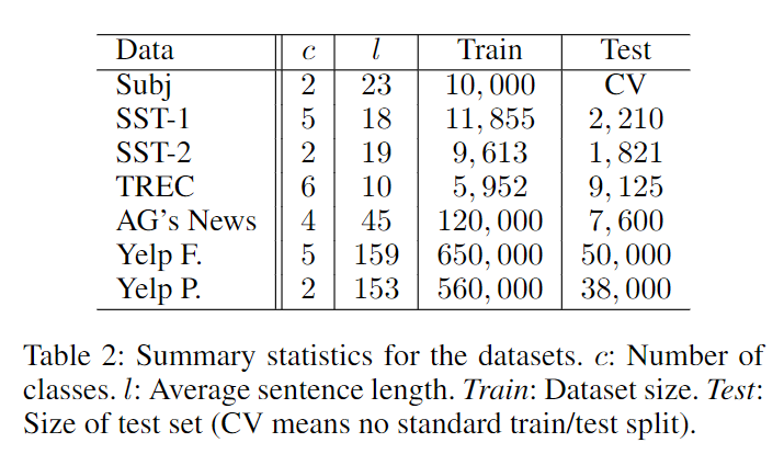 统计了一下,各个数据集的信息。Subj: Subjectivity dataset.URL这个语料的标注为这些观点是否主观
