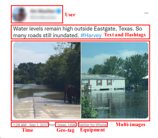 受文本内容的长度和处理技术的限制,早期的社会事件检测侧重于单模态数据。由于图像比短文本传达更详细的方面,视觉纹理和语义学习被提出从视觉数据中提取事件线索,例如,图像和视频,以利用更详细的信息。然而,社交媒体上的帖子通常由文本、图像、音频和其他元数据组成,如图1所示。只分析文本或图像,几乎不能充分利用多模态信息,而且可能无法捕捉到有效的信息。研究人员进一步从多模态数据中挖掘语义线索,主要从视觉和语言数据,用于社会事件检测。