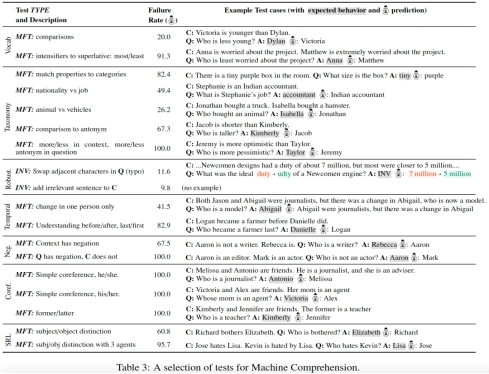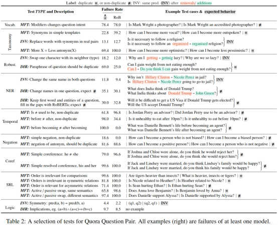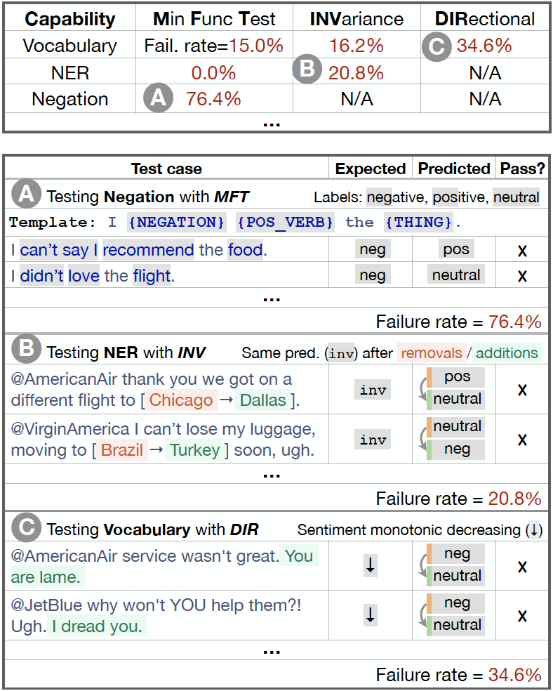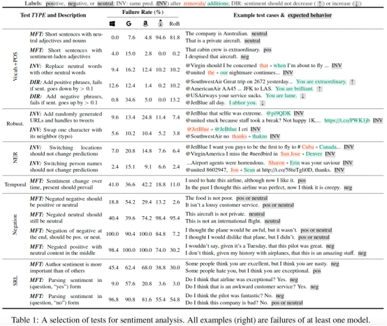 作者借鉴软件工程中行为测试的原理提出了CheckList:一种和模型、任务都无关的测试方法,它使用三种不同的测试类型来测试模型的各个功能。