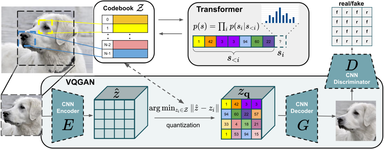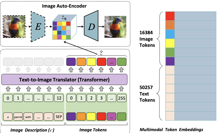 要学习多模态生成模型,我们首先要对文本和图像的统一表示进行建模。针对于文本,该文使用了BPE方法进行标记化。针对于图像作者使用了VQGAN进行标记化。如下图所示: