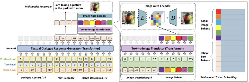 针对上述问题,作者的关键想法是通过拆分文本回复生成和图像回复生成,使依赖多模态对话的参数变得小而独立,因此可以从纯文本对话和<图像描述,图像>对中学习生成模型的主要部分,而这是更容易得到的。作者因此提出了一个新的模型Divter,它主要由两部分组成:纯文本对话回复生成器和文本到图像的转换器。其总体结构如下图所示: