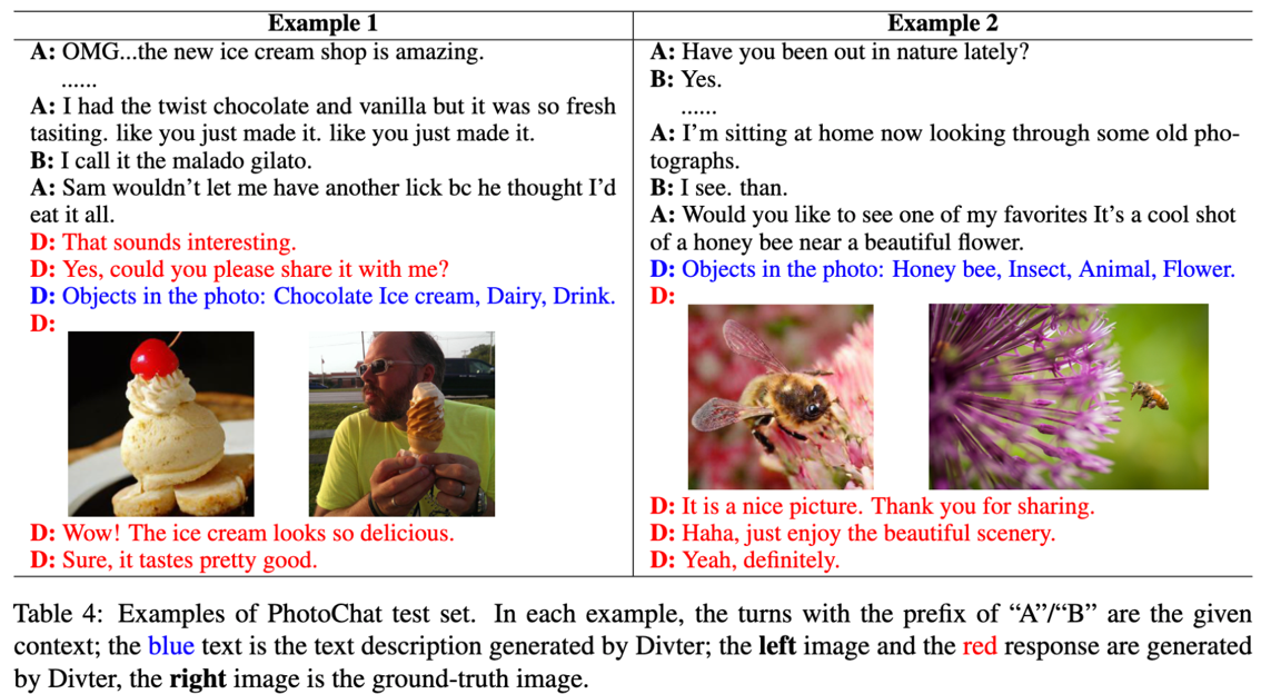 本文使用Reddit对话数据集预训练文本对话回复生成器,使YFCC100M and ImageNet数据集来预训练文本-图像转换器。模型PhotoChat数据集上的结果如下。
