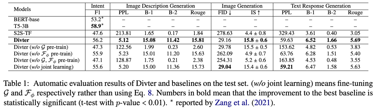 本文发表于ACL2022,提出了一个新的多模态对话回复生任务成,即对于给定的对话上下文,模型需要生成一个文本或图像作为回复。学习这样的模型通常需要包含文本和图像的多模态对话,而这是很难获得的。在这种低资源环境下,作者设计了一个新的对话模型Divter。它可以从整个生成模型中分离出依赖于多模态对话的参数。通过这种方式,模型的主要部分可以分别从大量的纯文本对话和文本-图像对中学习,然后只需使用少数训练实例就可以很好地拟合整个参数。大量的实验表明,该方法在自动和人工评估中都取得了最先进的结果,并能生成信息丰富的文本和高分辨率的图像回复。