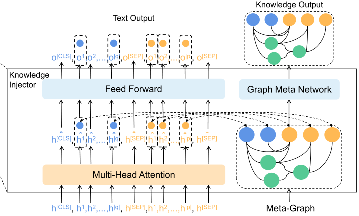 本文的主要目的是将外部知识图合理地引入到PLM中,用于文章的重新排序。我们首先设计了一种新的知识元图构造方法,从一般的、有噪声的知识图中提取可靠的相关知识并进行查询。知识元图弥合了每个查询和段落之间的语义鸿沟。然后,我们提出了一种用于文本和知识表示相互更新的知识注入器层,该层将文字表示转换为图元网络中的实体表示,反之亦然。知识增强排序模型通过掩蔽语言模型(MLM)句子关系预测(SRP)[38]任务进行预训练,并使用交叉熵损失函数对段落重新排序任务进行微调。在公共基准数据集上的实验结果表明,由于该方法是第一次尝试,因此与没有外部知识的最新基线相比,该方法是有效的。并对各个模块在KERM中的作用进行了全面分析。由于这项工作仅限于在线建立的查询-通道对的一对一元图,因此需要继续努力使知识增强在检索和重新排序阶段都更有效。