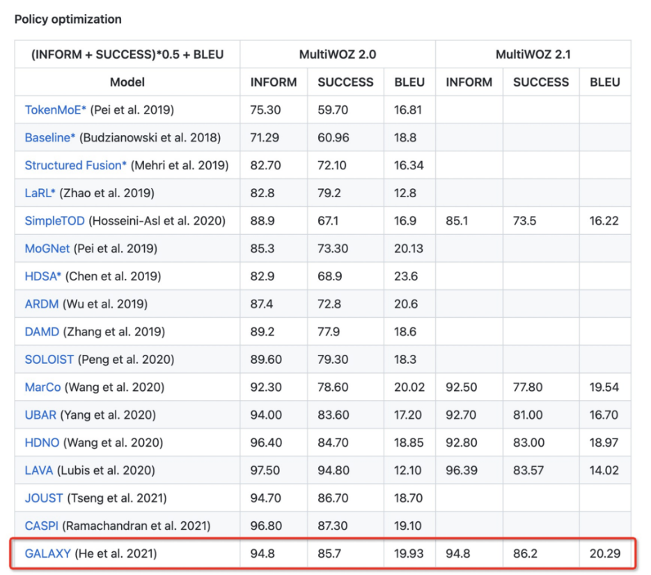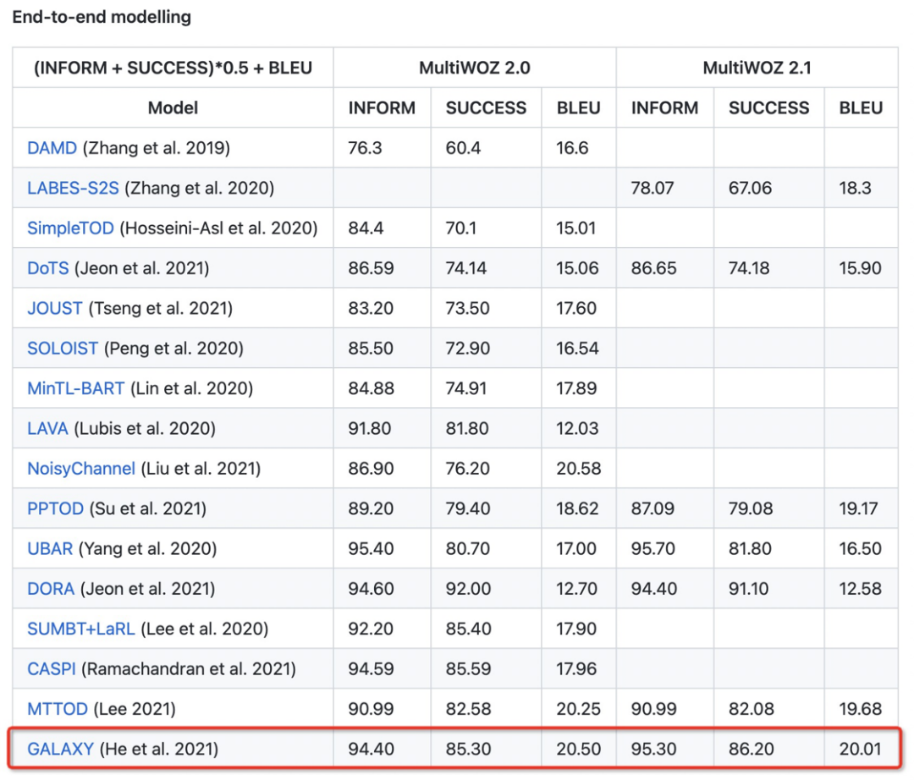 SPACE1.0 模型(即 GALAXY)目前在 MultiWOZ 官网上仍然排名第一,成绩截图如下所示: