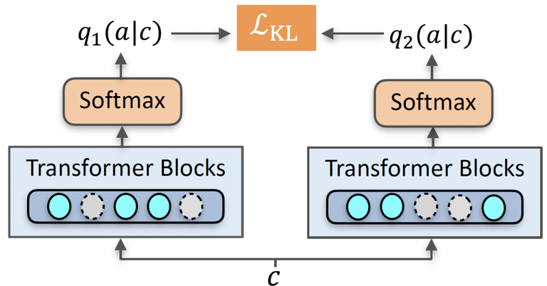 针对无标对话数据,我们采用了 R-drop [22] 的思路,如图 7 所示,给定同样的对话输入 c,经过两次带有 dropout 的 forward 得到了两次经过随机扰动后在对话动作空间上预测的不同分布,然后通过双向 KL 正则损失函数来约束两个分布;