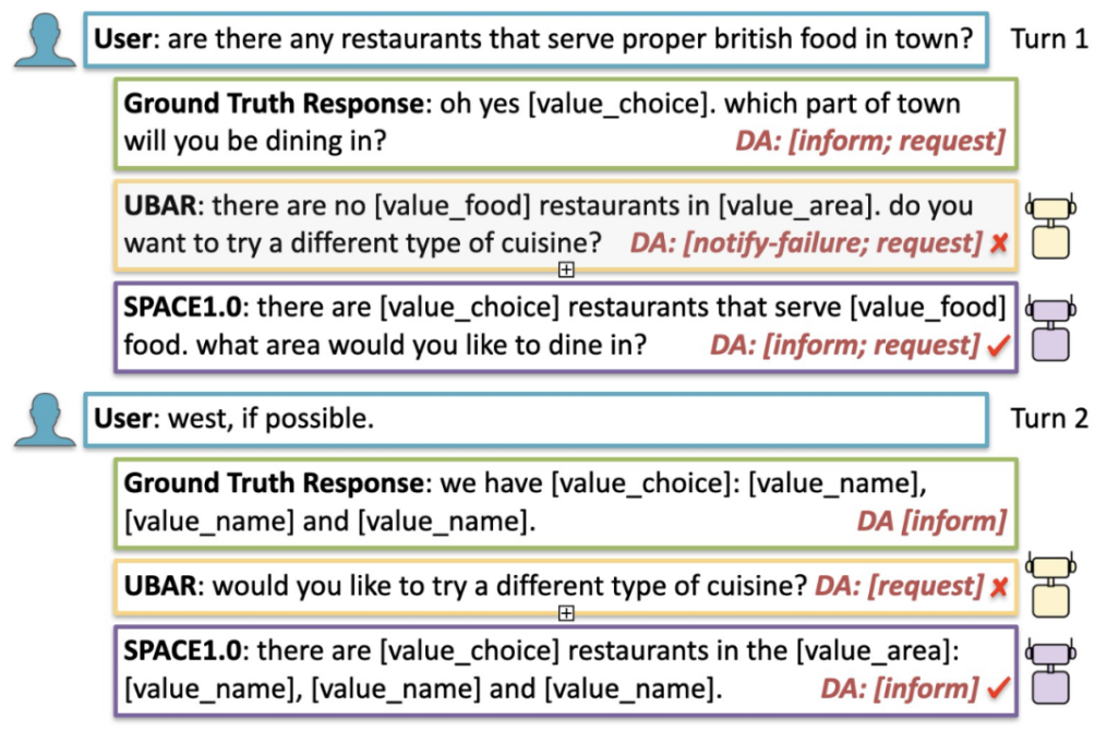 我们也进行了案例分析,从图 11 中可以发现,相比之前的 SOTA 模型,SPACE1.0 模型能够预测出更加正确的对话动作,因此,合理的对话策略能够提升整体的端到端任务完成效果。