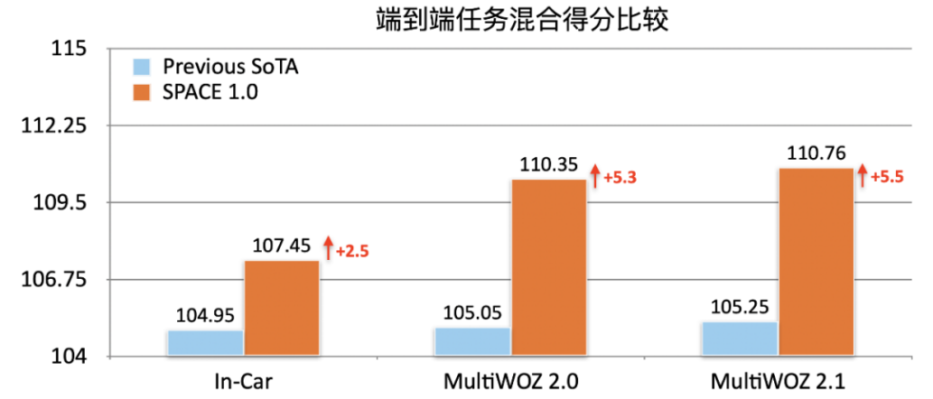 如图 9 所示,经过半监督预训练融入策略知识后,可以看到我们的 SPACE1.0 模型在这些对话榜单上均大幅超过了之前的 SOTA 模型,端到端混合分数在 In-Car,MultiWOZ2.0 和 MultiWOZ2.1 分别提升 2.5,5.3 和 5.5 个点:
