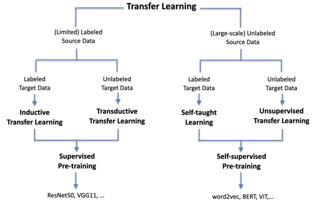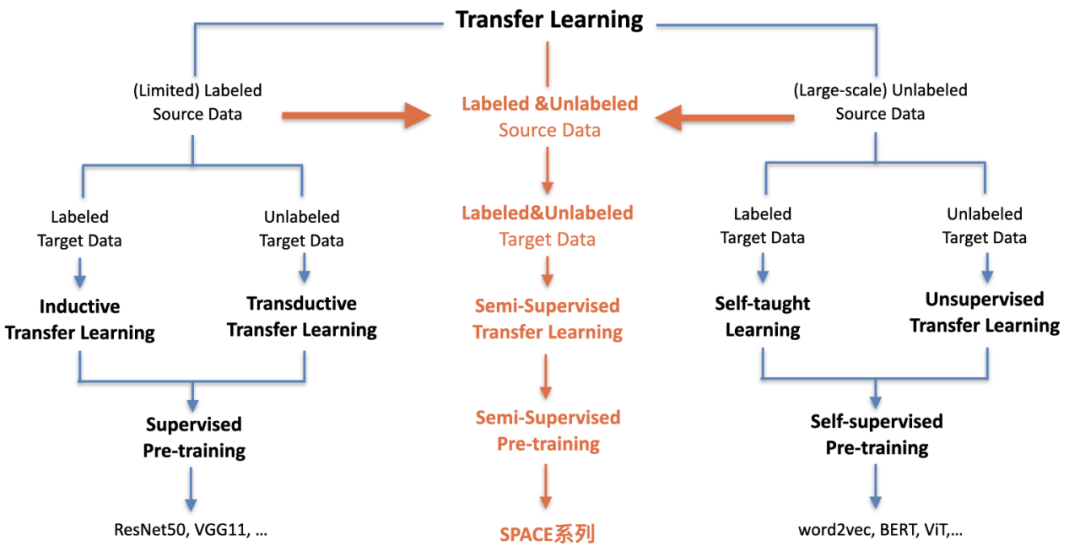 清华研究者们在综述 [5] 中从迁移学习的角度来统一审视了目前已有的两大预训练范式,如下图 1 所示,无论是有监督预训练还是自监督预训练,归根结底都是直接从数据中学出更加合理的分布式表示,从而能够更好地迁移适配到具体的下游任务。
