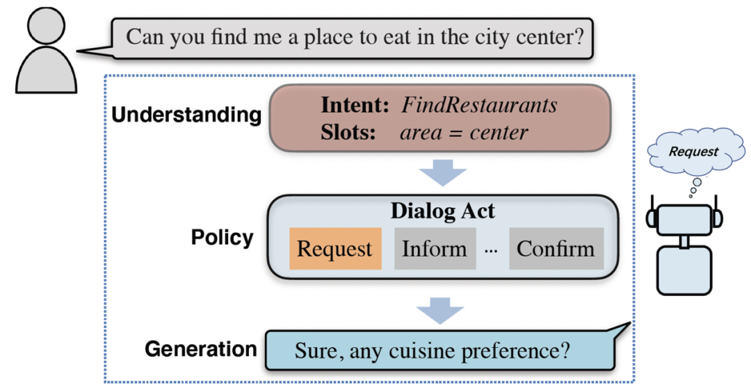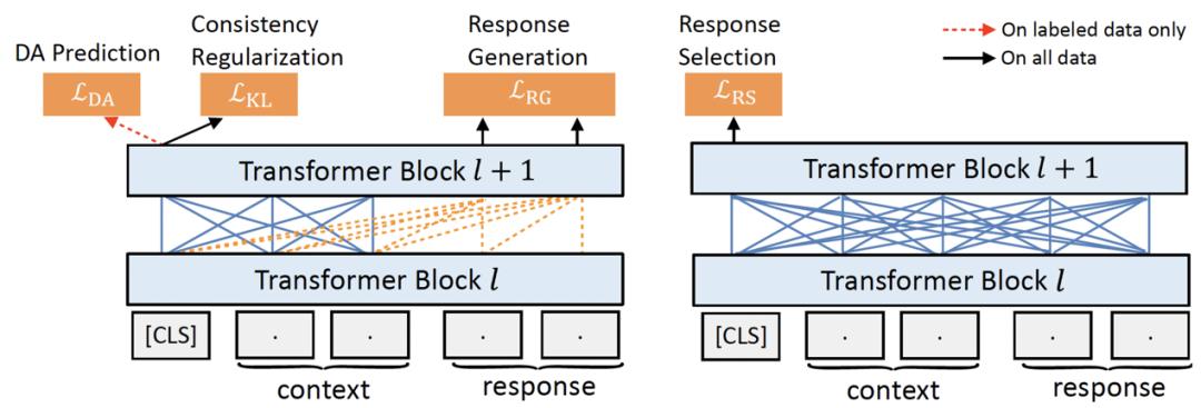 对话策略是对话过程中的一个重要模块,一般用对话动作标签(dialog act, DA)来进行刻画,即给定双方的对话历史,对话策略需要选择出正确的对话动作用于指导对话生成(图 5)。当前各种常见预训练对话模型,如 Meena,DialoGPT 等往往都直接将对话动作的选择过程隐含建模到模型参数里,存在着不可解释和不可控等问题。由于策略是一种高层语义,难以仅仅利用自监督的方式就能很好地学习出来。因此,接下来我们将从对话策略建模出发,提出利用半监督的方式实现更好的预训练,将标注数据中的对话策略知识融入到预训练对话模型中来。